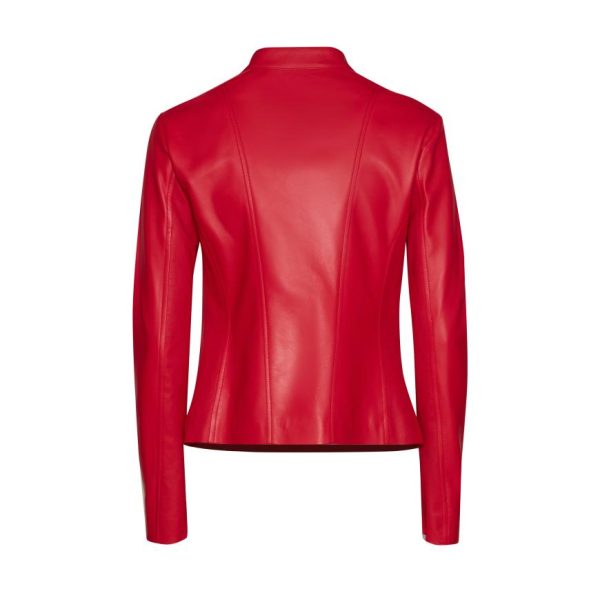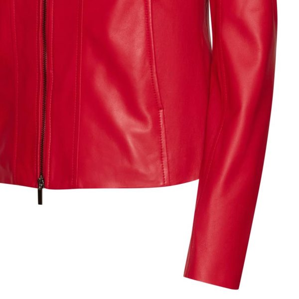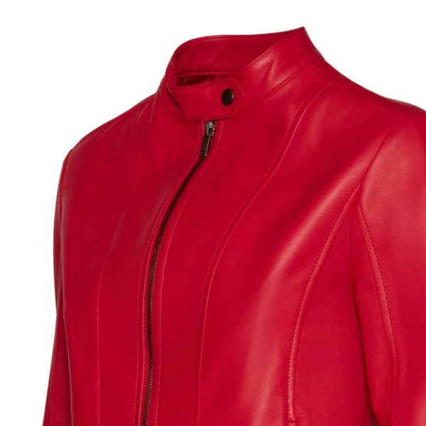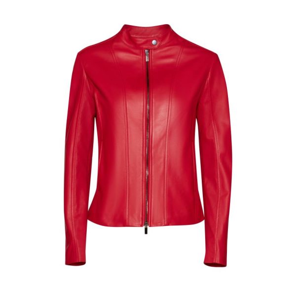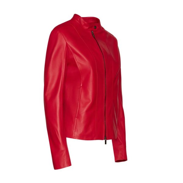 This biker-style design in soft nappa stands out for its vibrant coral colour. The stretch nappa inserts on the sides and under the arms guarantee comfort in the fit and highlight the silhouette. Central zip fastening with double puller, pockets on the side and press-stud fastening on the collar. Add a touch of colour and originality to every outfit.