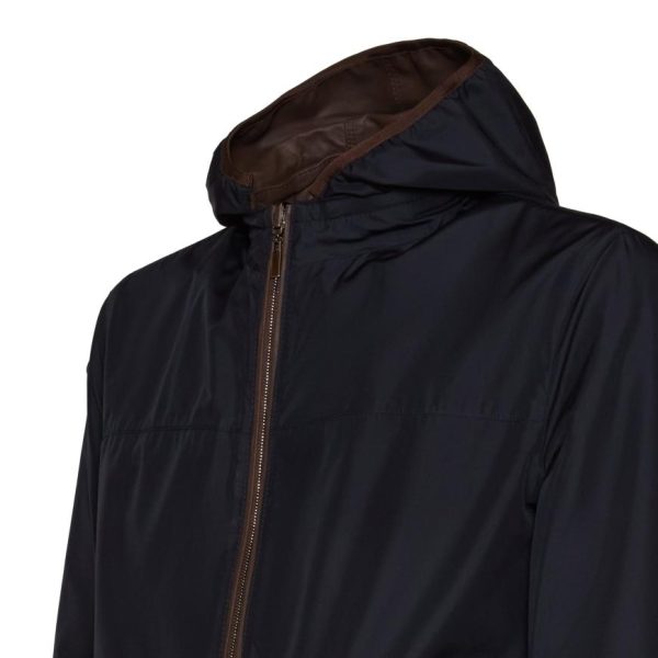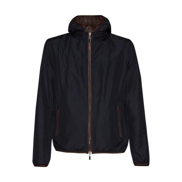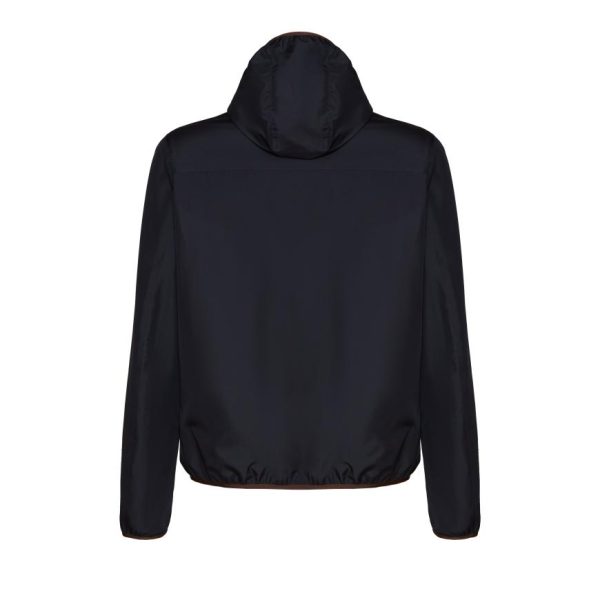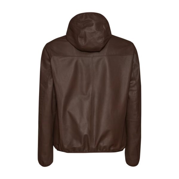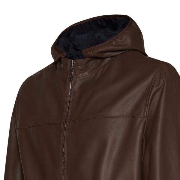 Reversible jacket made of soft brown leather with nappalan finish and contrasting-colour nylon interior. Casual and lightweight style with central zip fastening with double puller. The removable hood is also lined in nylon. Welt pockets. Versatile garment, an essential in case of sudden changes in weather.