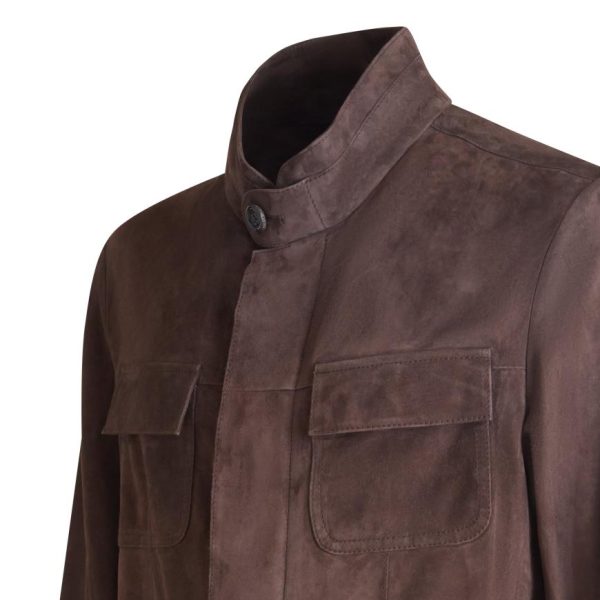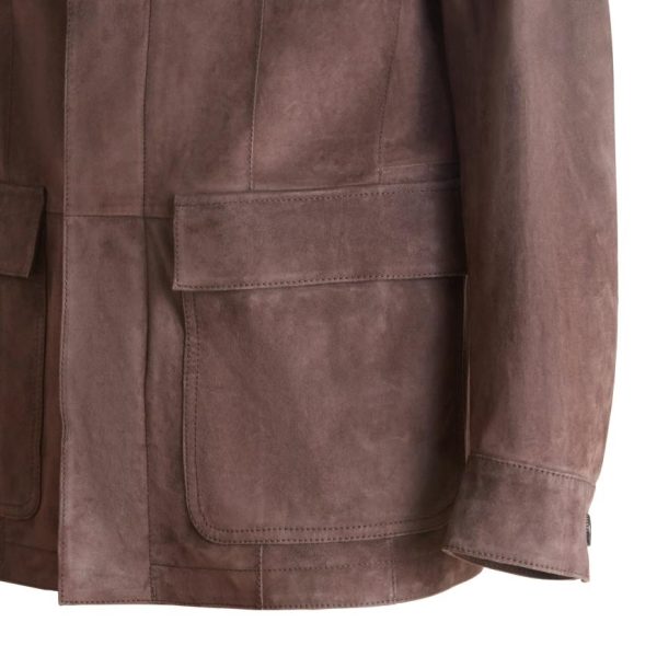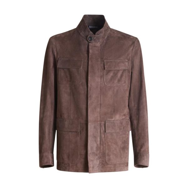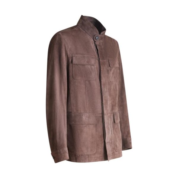 Timeless safari jacket made from soft, unlined brown suede. This model’s design combines refined details with casual elements, and is characterised by four flap pockets on the front and central fastening with buttons and covered zip.