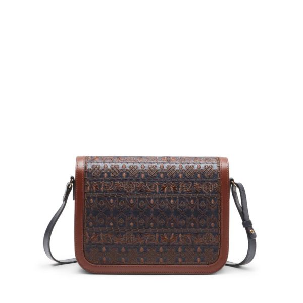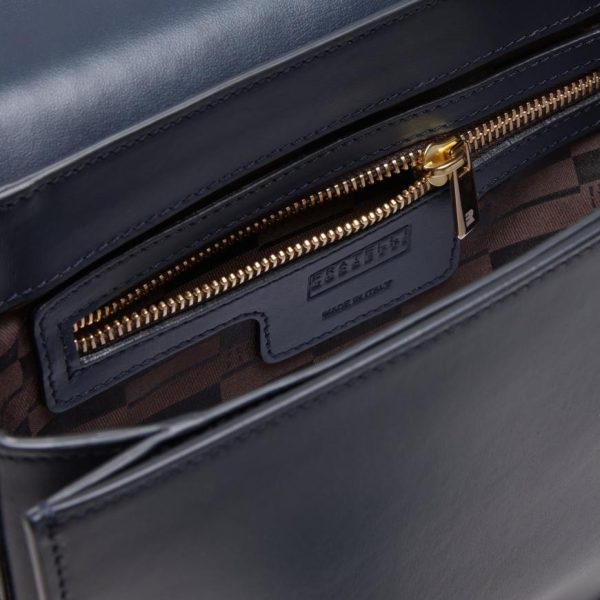 Borsa a spalla con tre compartimenti realizzata in morbida pelle vacchetta. Linee pulite e raffinate impreziosite da un ricamo artigianale eseguito a telaio. Il filato blu crea disegni contrastati di grande eleganza che evocano suggestioni orientali.
