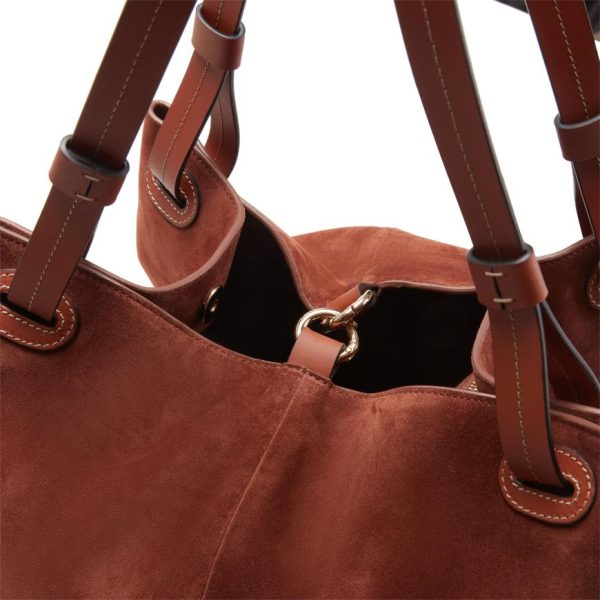 Sophisticated tote bag from the Royal line, made of cognac suede with smooth leather handles finished with contrasting stitching. Soft and roomy, it is divided into two compartments by a central zip pocket. Embellished with a removable, golden, three-dimensional R-logo pendant, the symbol of the maison.