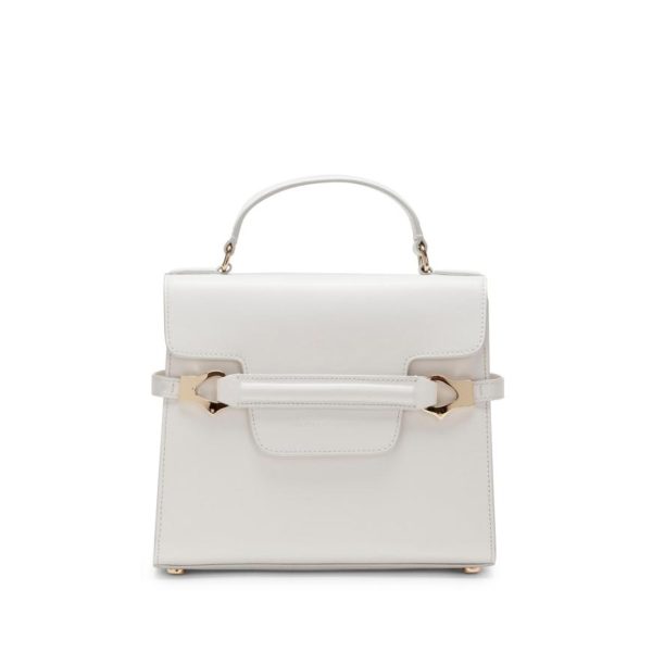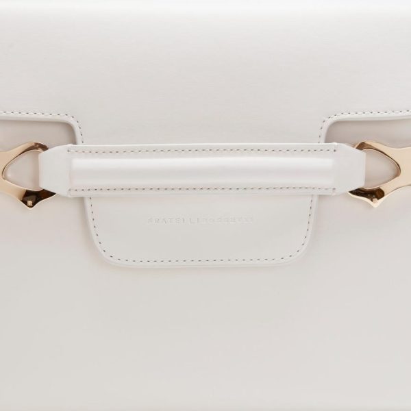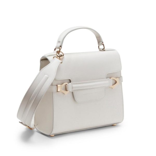 Top Handle bag from the Magenta line made of soft milk white leather with a nappa effect. Magnetic closure featuring the iconic light gold horsebit. Can be worn as a crossbody bag. The main compartment is equipped with a small zip pocket inside and a small pocket on the outside back. Logo lining.