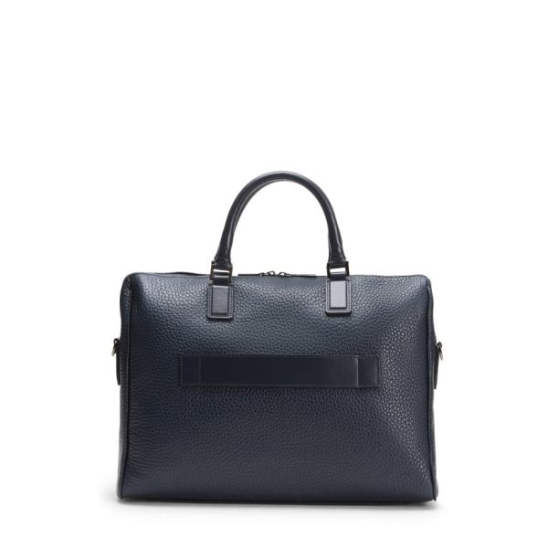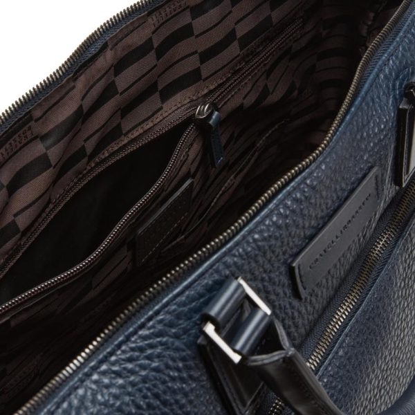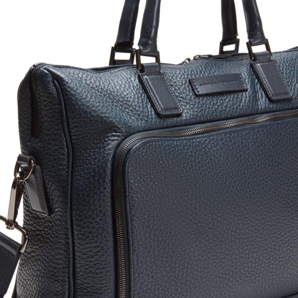 Refined business bag made of black leather with visible grain. Features a main compartment enriched by a leather logo insert, completed by a front pocket with zip around closure. The interior allows you to store personal items and devices in an organised, functional way. It can be comfortably carried by hand or over the shoulder using the specially designed shoulder strap for added comfort.