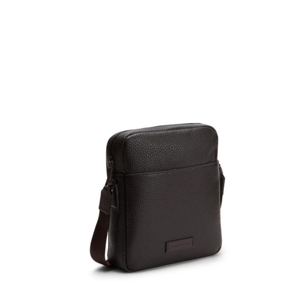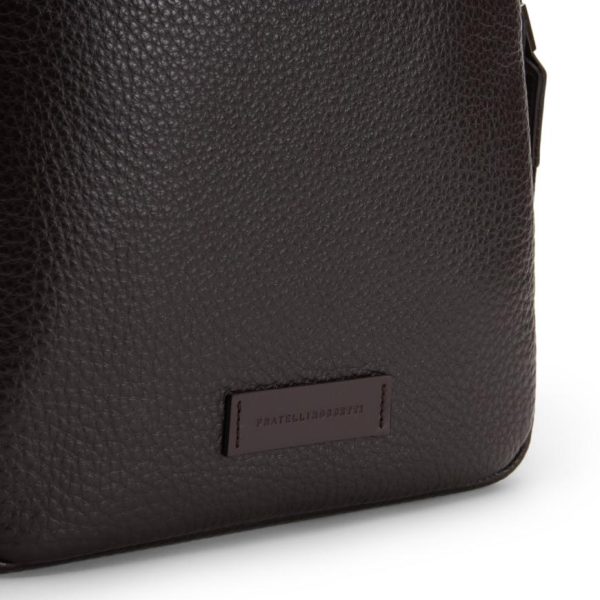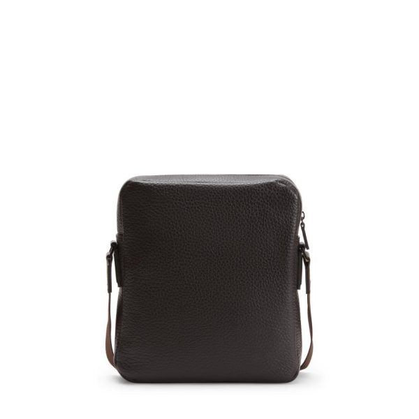 Vertical messenger bag crafted from brown leather with a visible grain, offering durability and a soft, supple feel. Its minimalist, geometric design features a spacious main compartment and a front pocket adorned with a tone-on-tone leather logo insert. It can be worn over the shoulder or cross body for greater comfort, thanks to the shoulder strap.Art. 84843