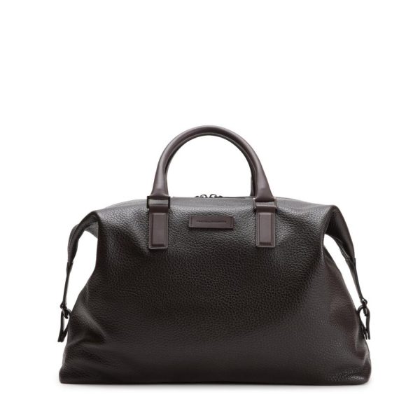 Spacious, functional, and with a timeless design, this travel bag is crafted in brown leather, characterised by a visible grain that combines durability and softness to the touch. Designed for those who travel in style, it can be comfortably carried by hand, or with the shoulder strap for added convenience. The main compartment, enriched with a logo-embossed leather insert, offers ample space for clothing and accessories, while the internal pocket is ideal for securely storing personal items.