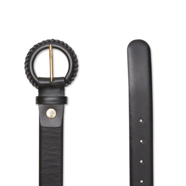 Women’s belt with smooth shaft made of soft leather. The round leather-covered buckle is finished with matching stitching and adds a touch of femininity. 35 mm deep.