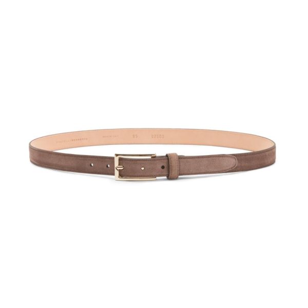 Women’s belt made of soft suede. Rectangular buckle with light gold finish. It can be conveniently cut to size. Height 2.5 cm.