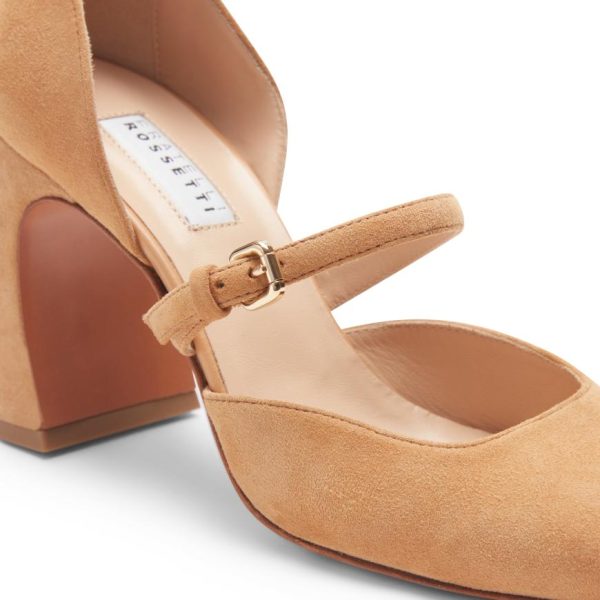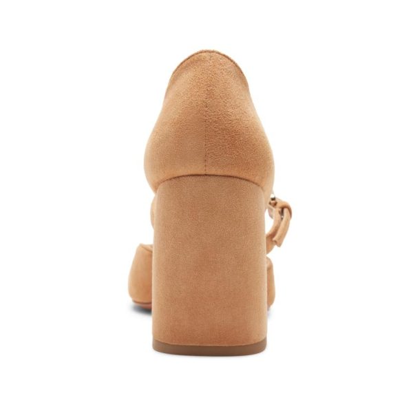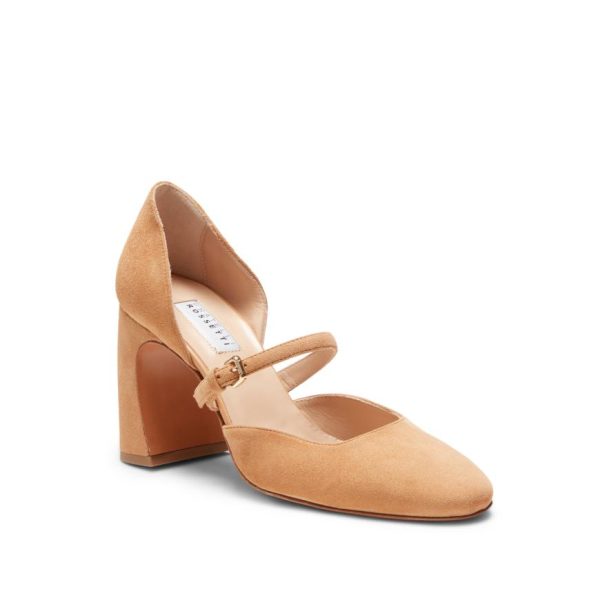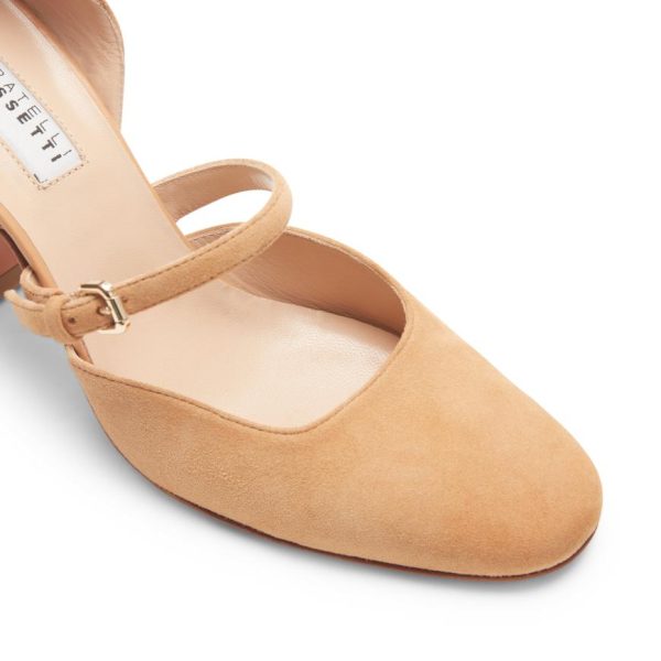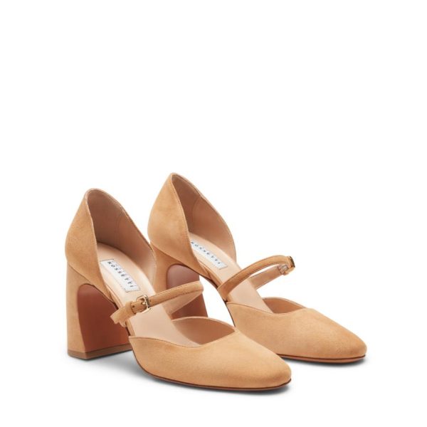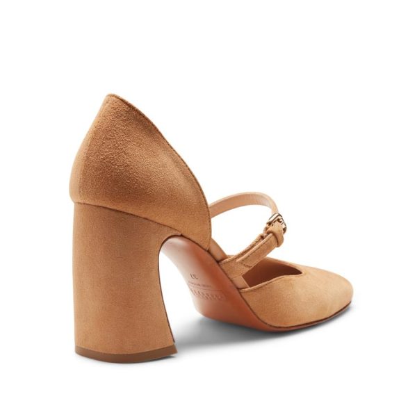 Sophisticated Mary Jane pump made of soft walnut-coloured suede. The comfortable heel with slender silhouette and thin strap make them suitable for day and evening outfits.