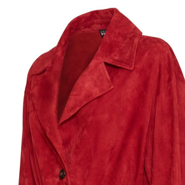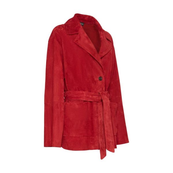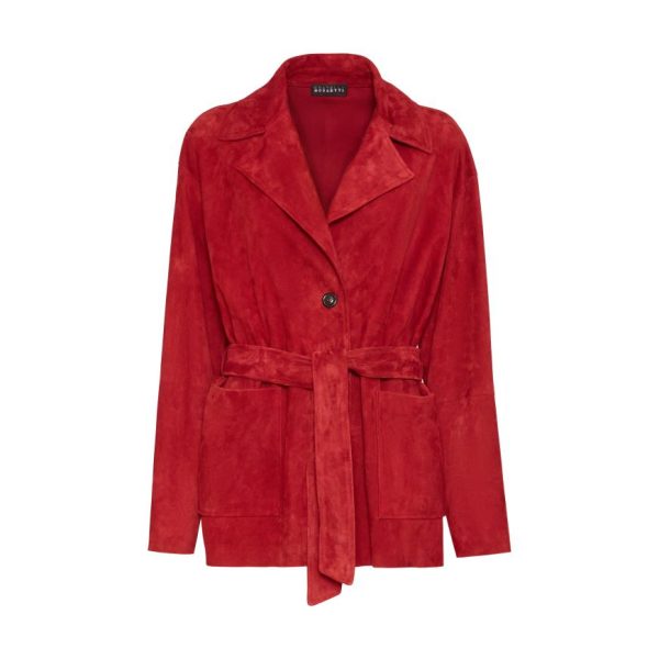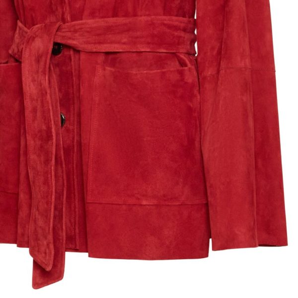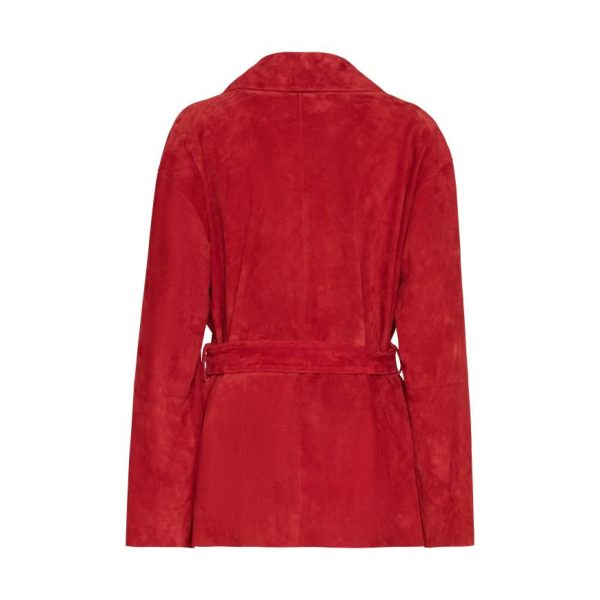 Giacca dal fit rilassato e raffinato, realizzata in morbida pelle scamosciata borgogna. Si distingue per la chiusura con bottoni, le tasche applicate e l’elegante cintura abbinata. Il colletto a bavero e le spalle cadenti conferiscono un look contemporaneo e sofisticato.