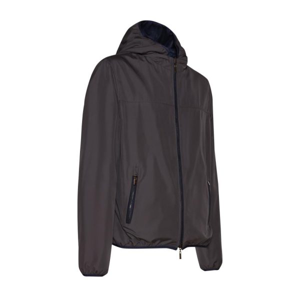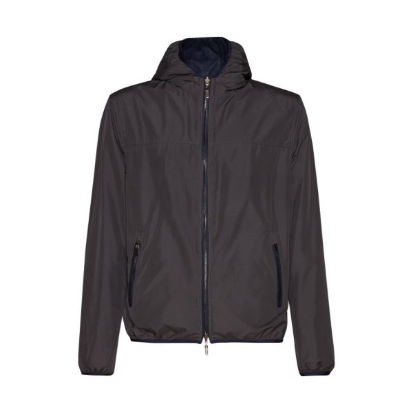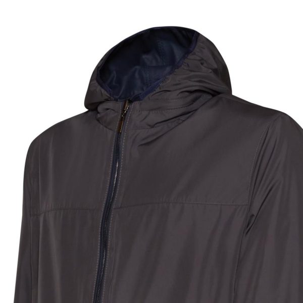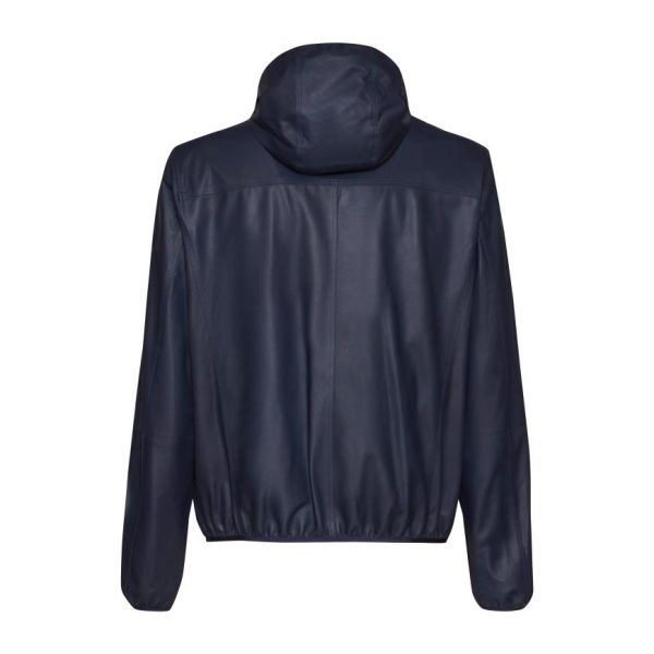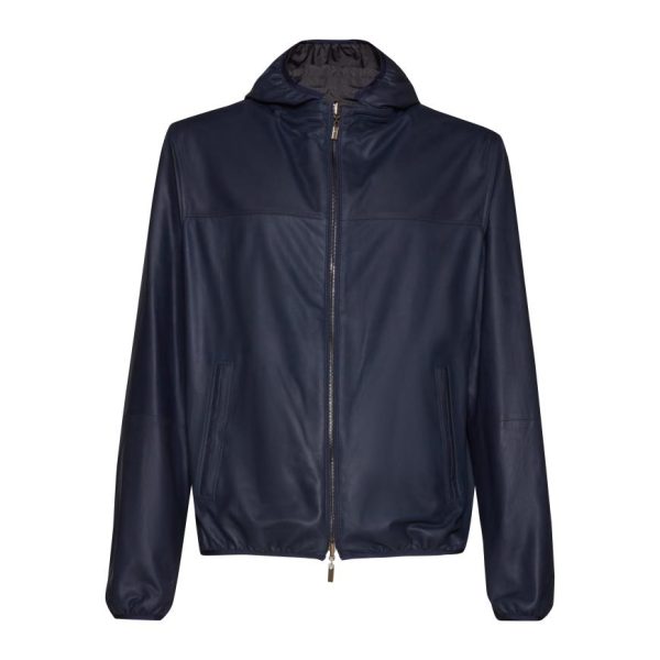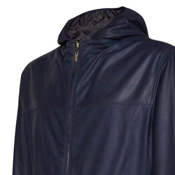 Giacca reversibile di straordinaria eleganza, realizzata in pregiatissima pelle nappalan blu dalla texture morbidissima, con interno in nylon contrastante. Design contemporaneo e leggero, impreziosito da una cerniera centrale con doppia tirante per una chiusura perfetta. Il cappuccio rimovibile è interamente foderato in nylon. Tasche a filetto. Capo versatile ed essenziale, compagno ideale per affrontare con stile ogni imprevisto meteorologico.
