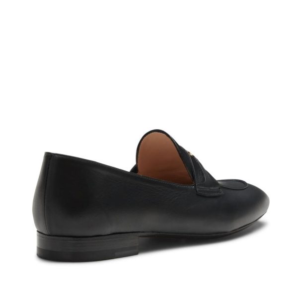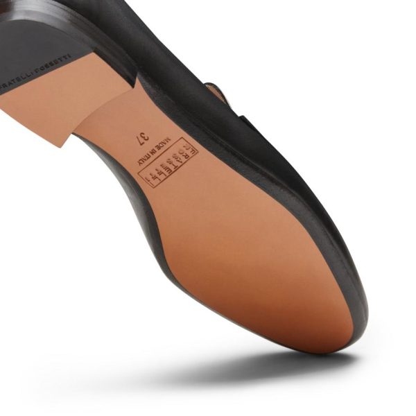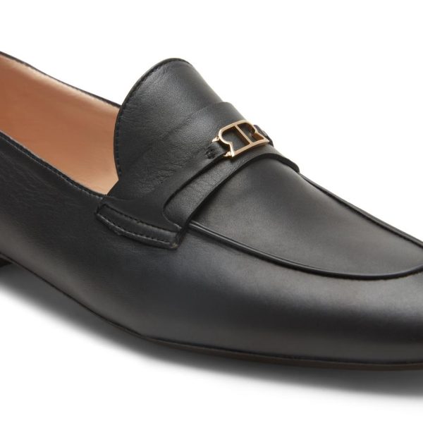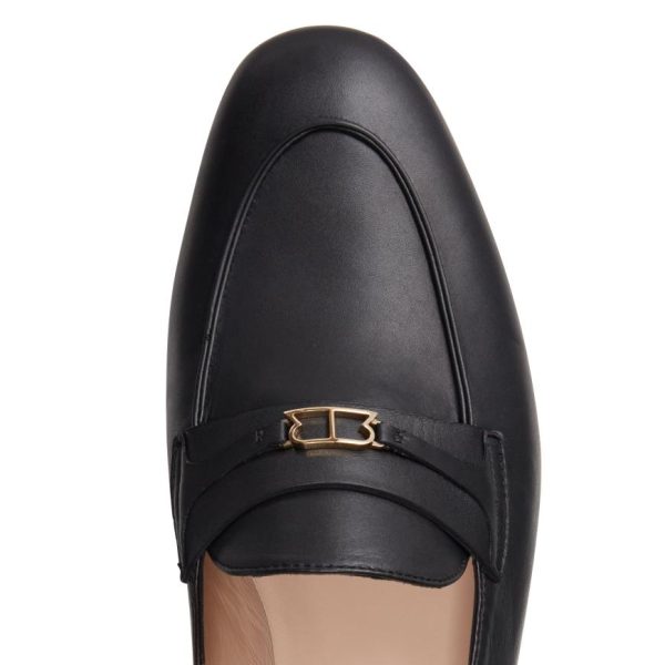 Rounded loafer with a sophisticated and feminine look, made of soft, smooth black leather with a nappa effect. The tone-on-tone leather strap is decorated with a gold accessory that picks out the brand’s logo.
