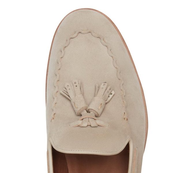 Beige suede Brera loafer, an icon of timeless elegance and innovation, becomes the star of the summer collection thanks to the lettuce leaf trim stitching. This technique highlights the master craftsmanship, the thread is stretched and worked to create a serpentine effect that gives a dynamic and three-dimensional look to the shoe.