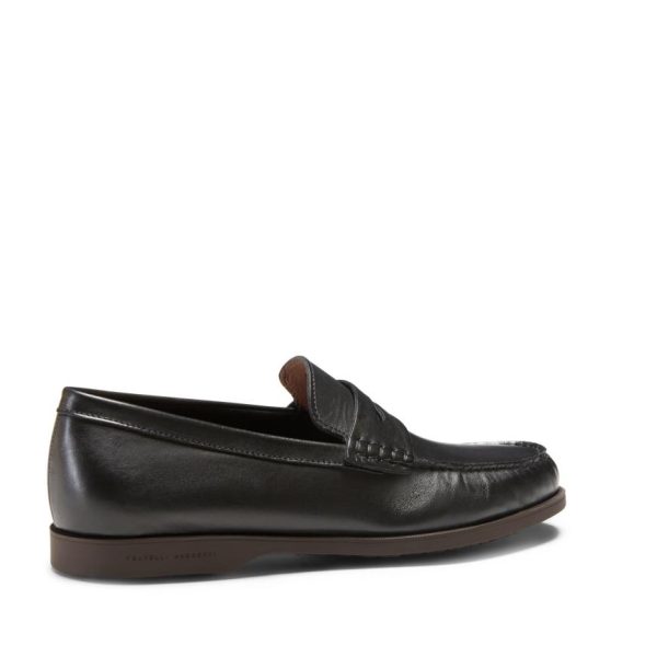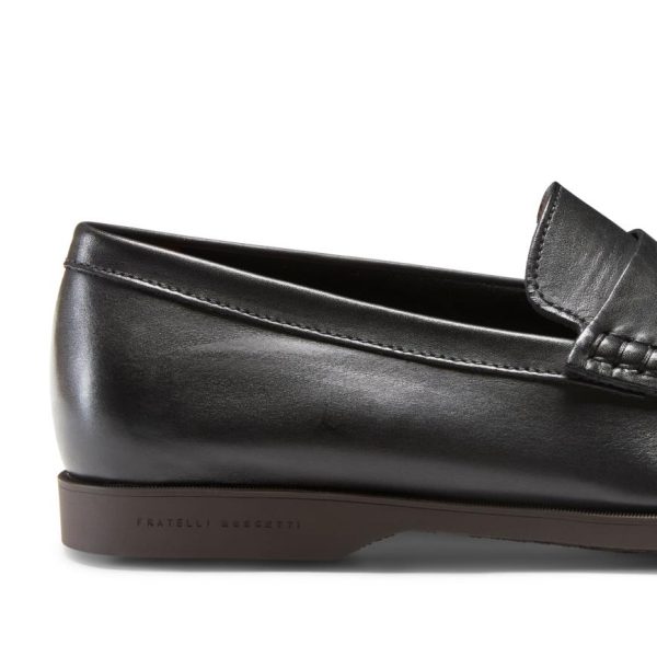 Tubular construction band loafer made of soft smooth black leather with a slightly antiqued effect. Extremely versatile and sophisticated shoe. Black rubber sole which matches the upper with a particular texture that accentuates the comfort of the shoe.