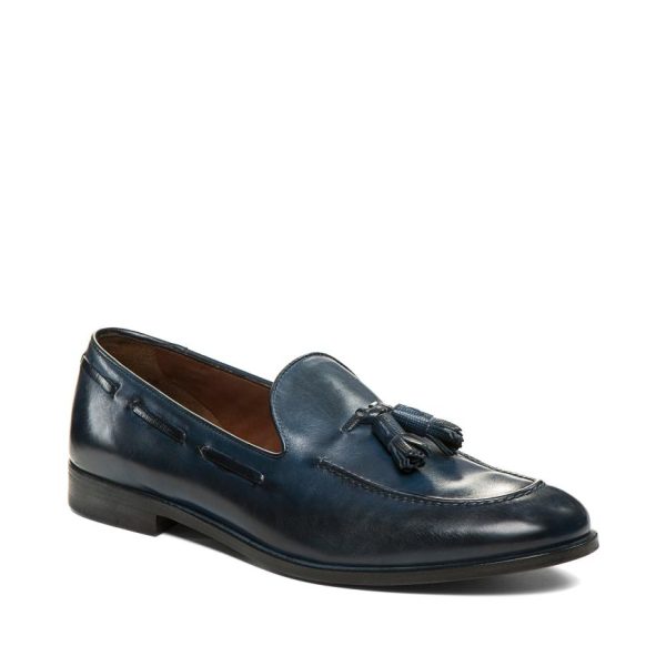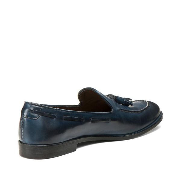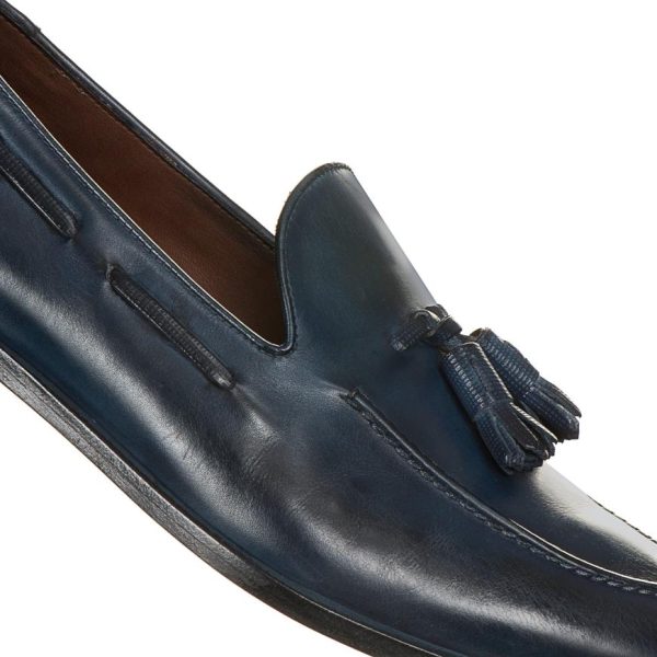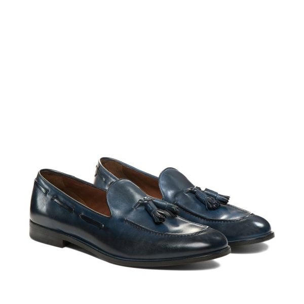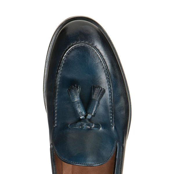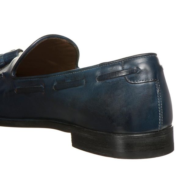 The iconic Brera loafer is ready for summer in this version made of soft navy blue leather with a gradient look. The leather is coloured by a hand-buffing process, the final appearance is an antiqued-effect leather with deeper colour nuances on the toe and spur
