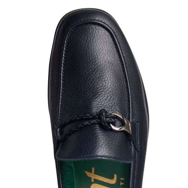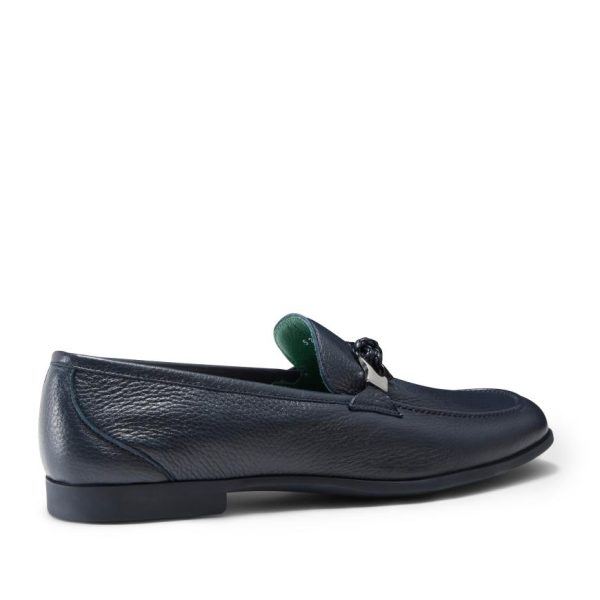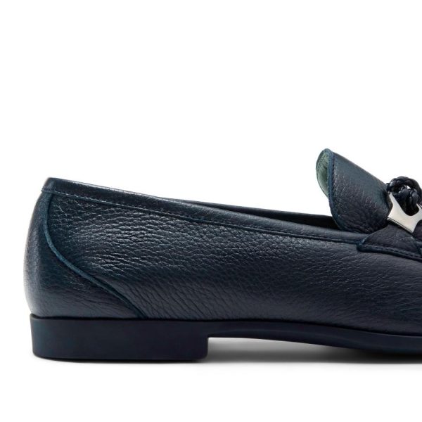 Band loafer from the Yacht line, made of soft, smooth, navy blue leather. The shoe is characterised by the detail of the strap with metal horsebit and woven strap. The breathable foam lining, leather insole and thin ultra-lightweight rubber sole make the shoe perfect for the summer season