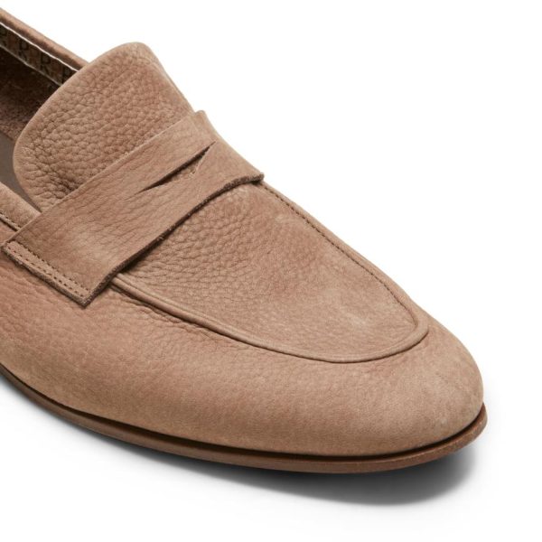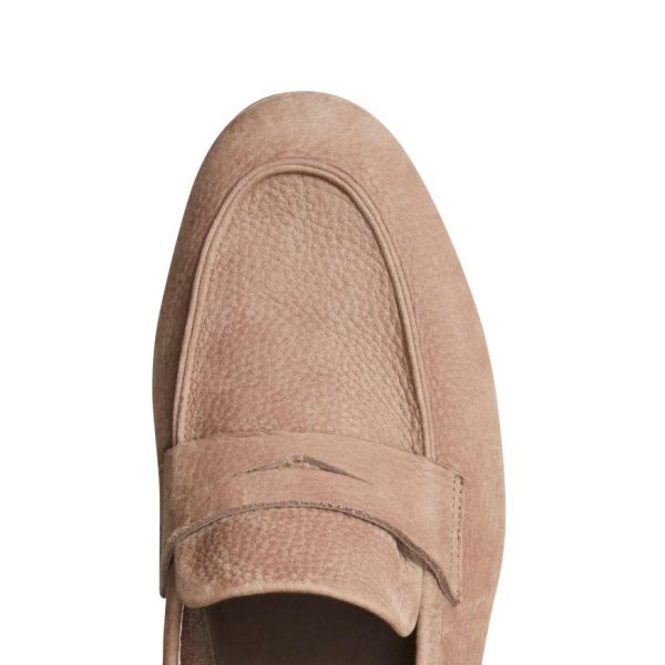Unstructured, unlined band loafer from the Summer line, made of soft dove-grey nubuck leather with visible grain. Lightweight and flexible shoe. Logo edging on the interior.