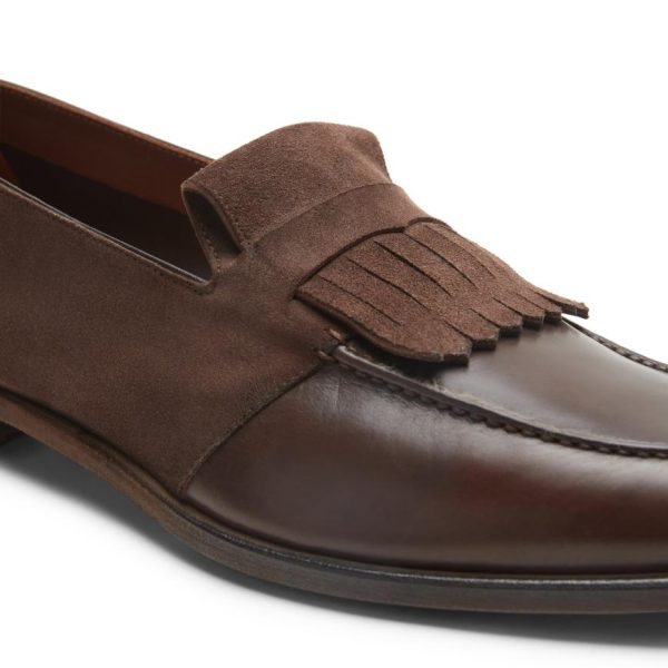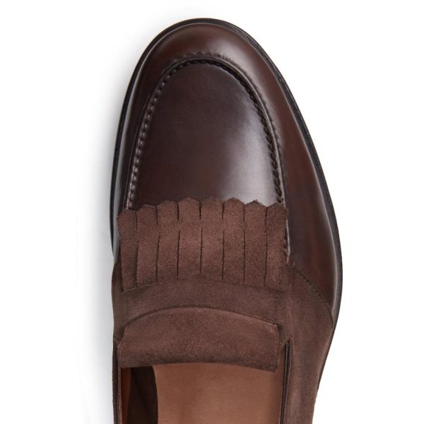 Mocassino bi-materiale realizzato in pregiatissima pelle scamosciata e morbida pelle leggermente anticata, con elegante contrasto tono su tono nel marrone. La caratteristica frangia piegata dona alla calzatura un carattere unico, perfetto per un look casual ma sofisticato.
