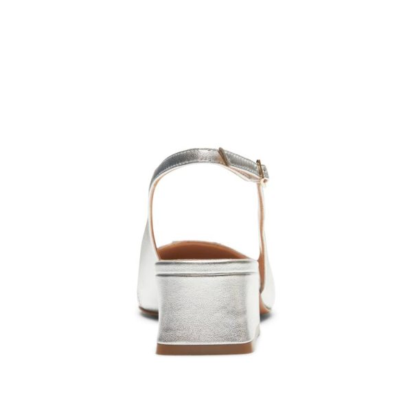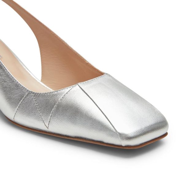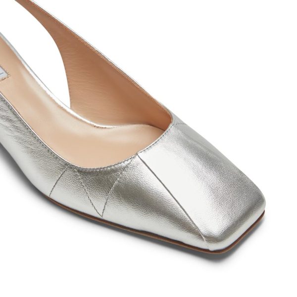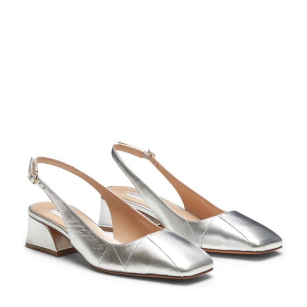 Raffinato sandalo slingback dalla silhouette leggermente squadrata, realizzato in morbida pelle argentata con effetto metallizzato. Un capo di puro stile italiano arricchito da dettagli sofisticati come la cucitura zigzag e le pieghe che creano un gioco di movimento sulla punta.
