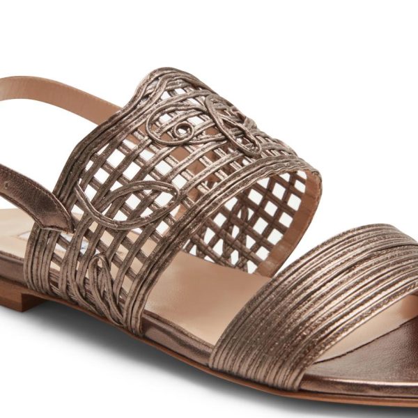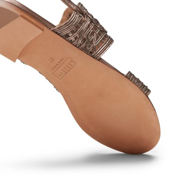 Refined and exclusive flat sandal made of soft bronze leather. Sophisticated style shoe that is characterised by craftsmanship with thin leather strips expertly sewn along the upper creating the Hobo flower.