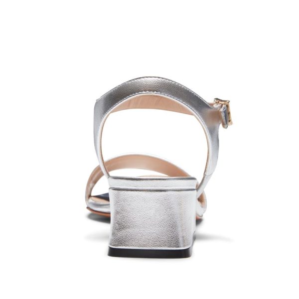 Refined strappy sandal made of soft silver leather with metallic effect. Simple style shoe with sophisticated details such as zigzag stitching and creases that create movement on the toe. The ankle strap offers a comfortable fit.