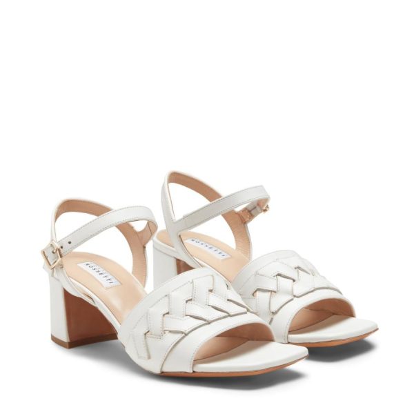 Refined sandal made of soft smooth white leather. The band is made up of intertwining strips that create a sophisticated geometric design. Comfortable to wear thanks to the medium heel.