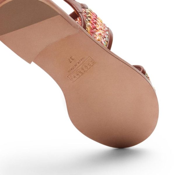 Flat double-strap sandal made of multicoloured fabric combined to create a woven effect. The almond leather trim adds a handcrafted touch. Refined and feminine footwear, perfect for hot summer days.
