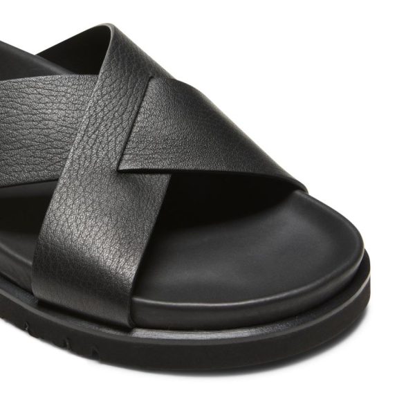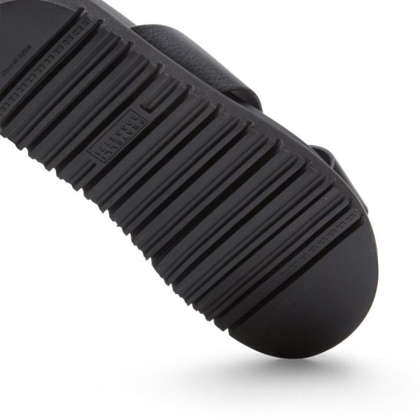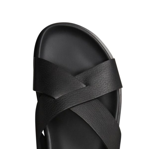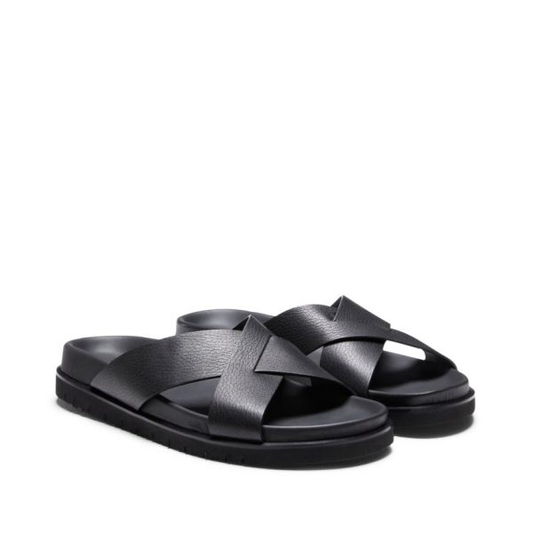 Sandalo slip-on dall’estetica casual raffinata, realizzato in pregiatissima pelle nera dalla grana visibile e morbida al tatto. Caratterizzato da fasce incrociate con finitura raw-cut che donano un carattere contemporaneo. Suola anatomica in gomma confortevole, perfettamente abbinata alla tomaia per un look armonioso.