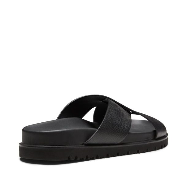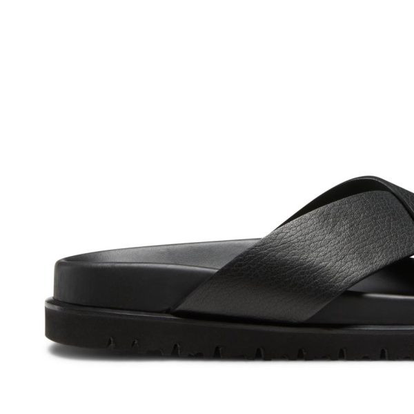 Sandalo slide dal look casuale, realizzato in pregiatissima pelle nera morbida con grana visibile. Caratterizzato da fasce incrociate con finitura raw-cut che esalta l’artigianalità del prodotto. Comodissima suola anatomica in gomma leggera dello stesso colore della tomaia.