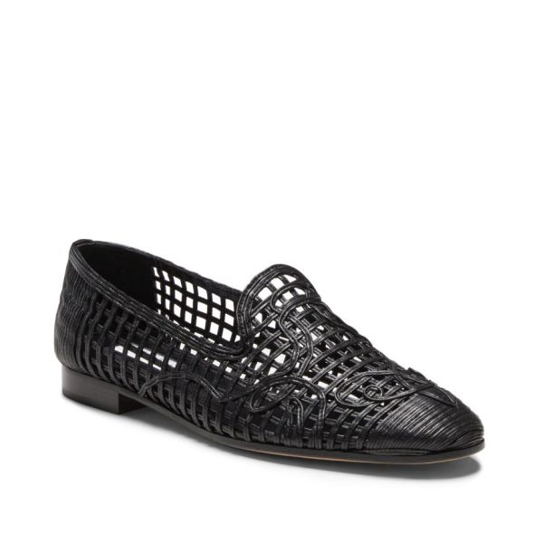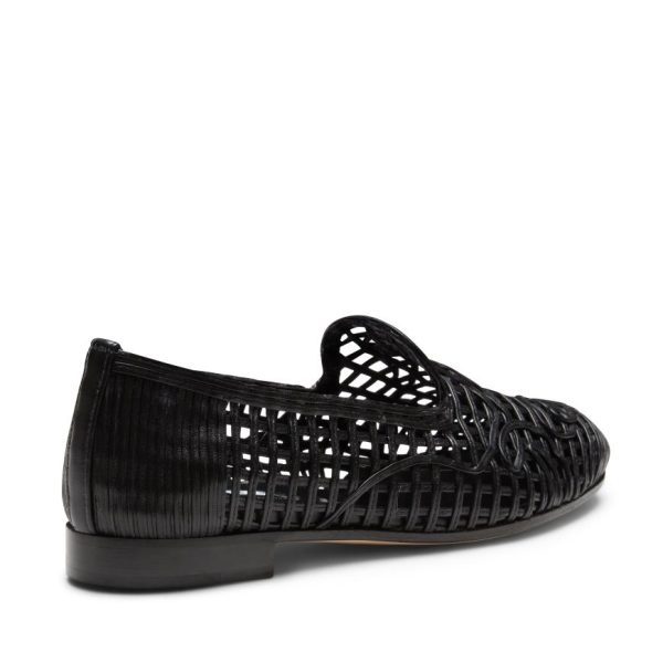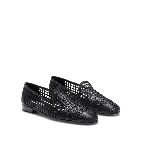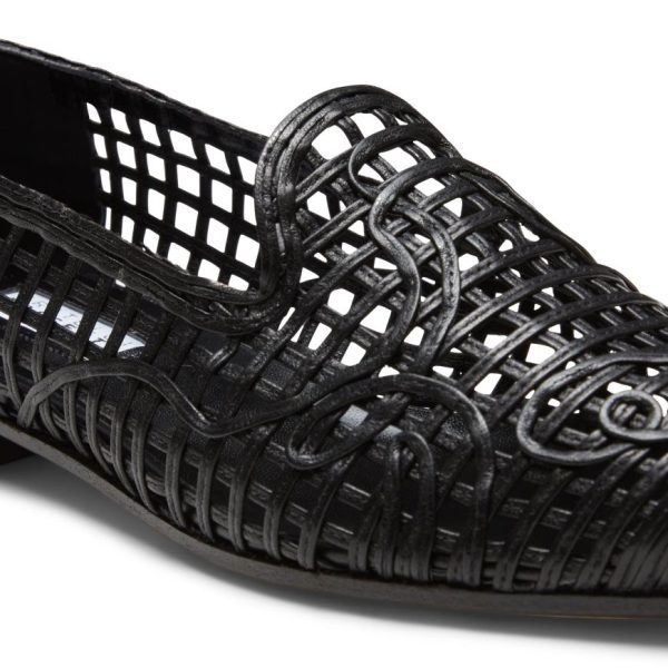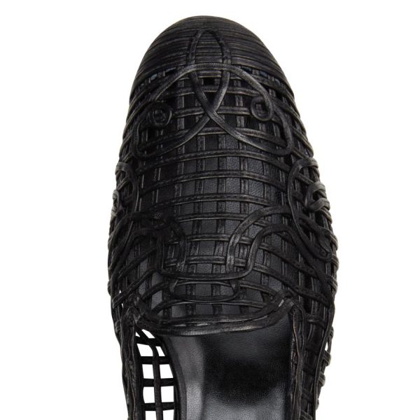 A sophisticated, exclusive slipper made of soft black leather. The craftsmanship includes thin leather strips expertly sewn together along the upper, creating the Hobo flower on the toe.