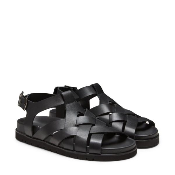 Refined sandal made of soft black leather with visible grain. Featuring criss-crossed bands with a raw-cut finish and ankle strap. The sophisticated yet casual design of this model is enhanced by a comfortable anatomical rubber sole that matches the colour of the upper.
