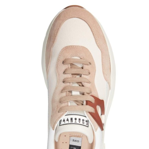 Sneaker dinamica che incanta con una combinazione sofisticata di colori e materiali: tessuto, pelle e suede nelle tonalità bianco latte e rosa. Calzatura che reinterpreta con stile il concept dello staffile Magenta, con un dettaglio accessorio in pelle liscia e cerata che funge da passante per i lacci. Per chi desidera il comfort di un outfit sportivo senza rinunciare a un tocco di glamour ed eleganza.
