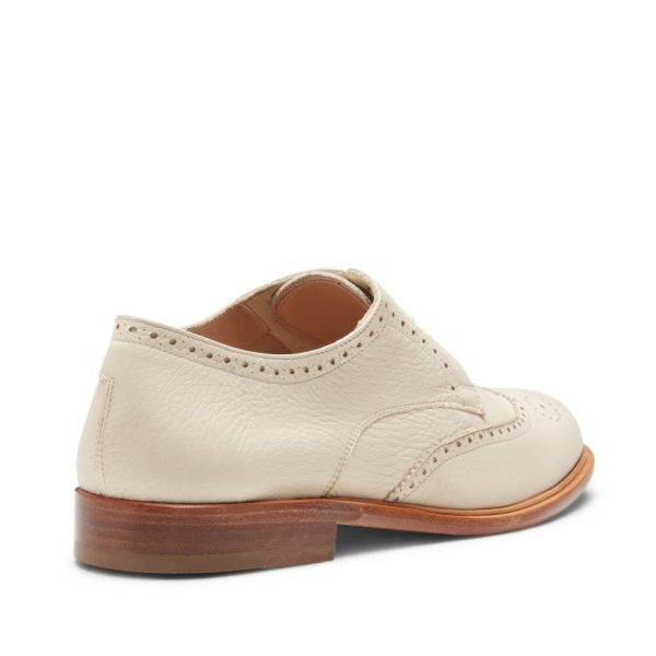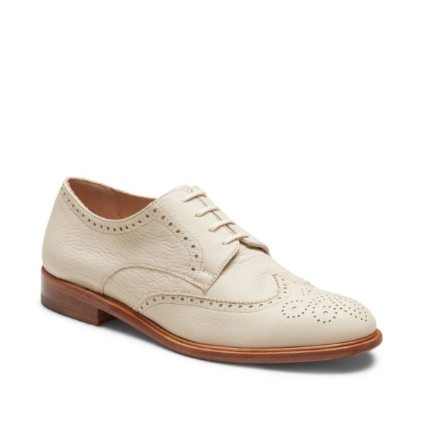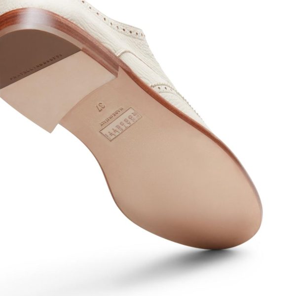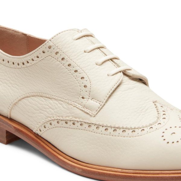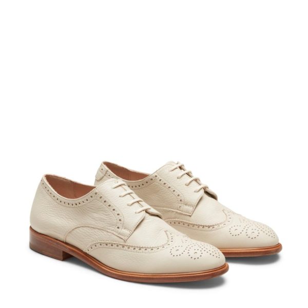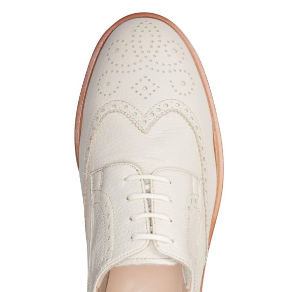 Refined rounded lace-up Derby shoe made of soft, milk white leather. Footwear with a sophisticated and masculine look, the flower perforations on the toe evoke the precise hallmarks of handcrafted footwear.