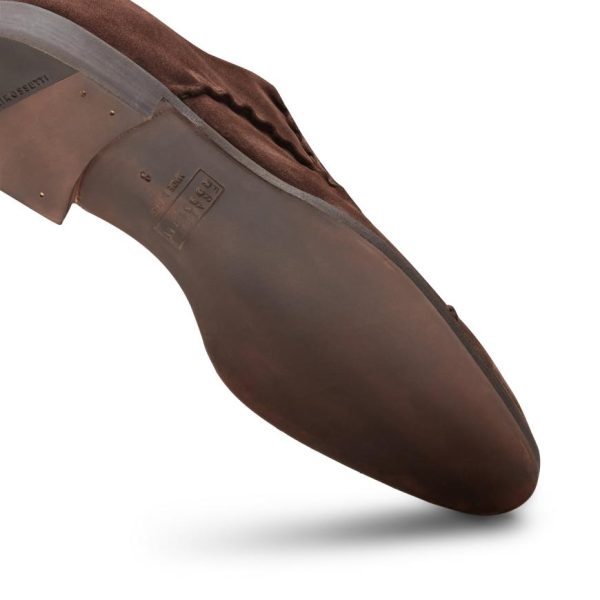 This refined brown suede Oxford shoe is the star of the summer collection thanks to the lettuce leaf trim stitching adorning the toe and trim of the upper. This technique highlights the master craftsmanship, the thread is stretched and worked to create a serpentine effect that gives a dynamic and three-dimensional look to the shoe.