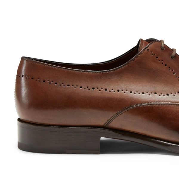 Timeless elegance for the tapered lace-up Derby shoe. Made of chestnut leather with an exclusive craftsmanship that gives the shoe a slightly antiqued effect and an enhanced shine. The perforations embellish the toe and the edging on the upper.