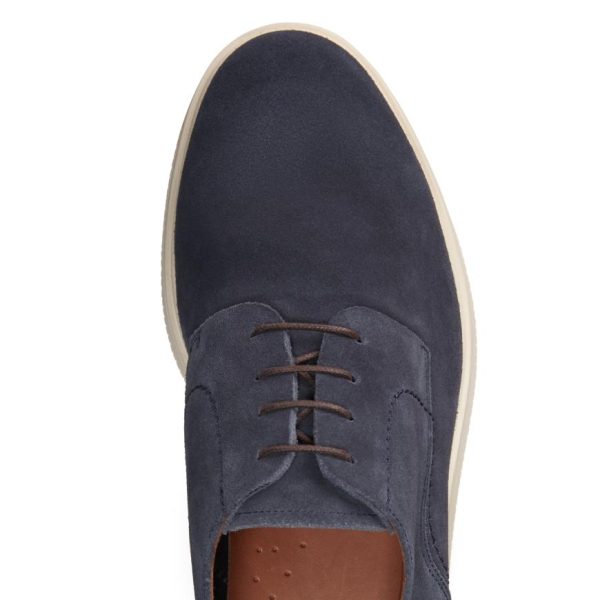 Smooth derby lace-up with a casual and refined look, made of navy blue suede. The slightly rounded shape, deconstructed line and lightness of the sole make it versatile enough to complete all seasonal outfits.