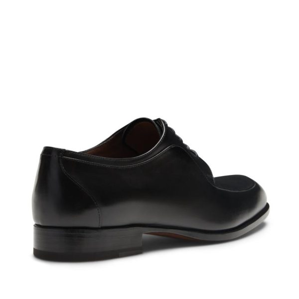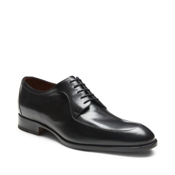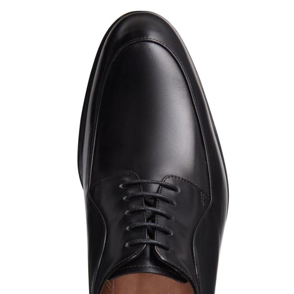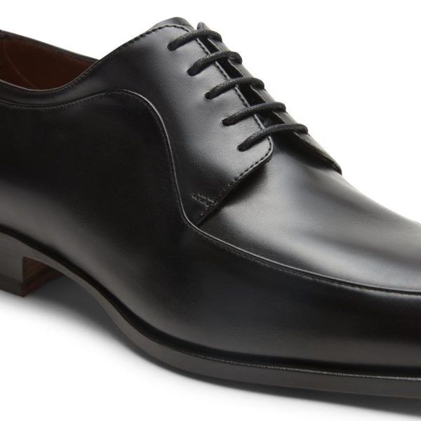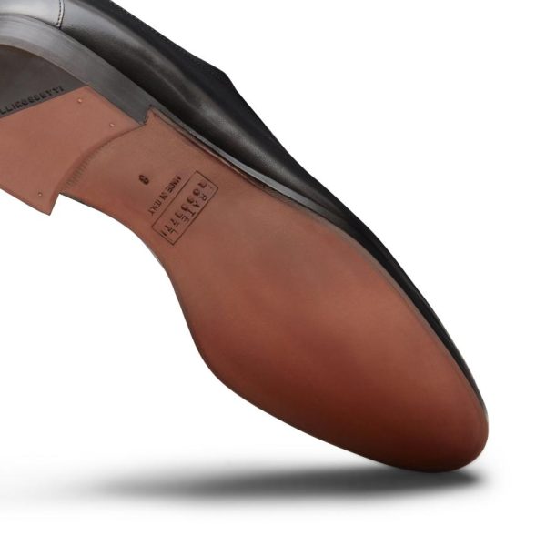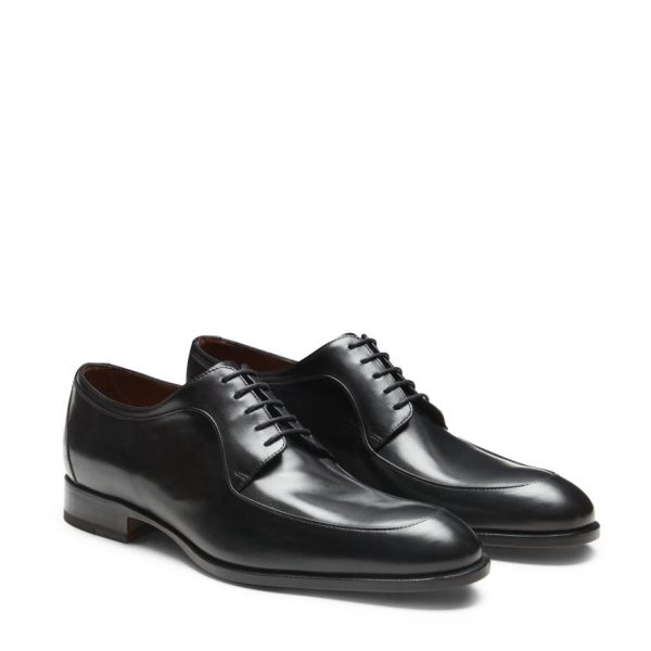 Raffinata scarpa Derby con allacciatura, realizzata in morbida pelle nera di pregiata fattura. La calzatura si distingue per la cucitura che disegna eleganti linee sinuose sulla tomaia. L’esclusiva lavorazione artigianale attraverso la spazzolatura crea un effetto leggermente anticato di grande carattere.