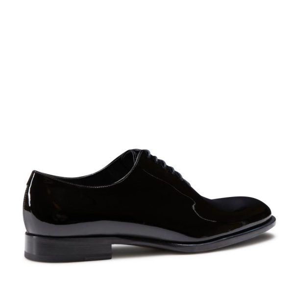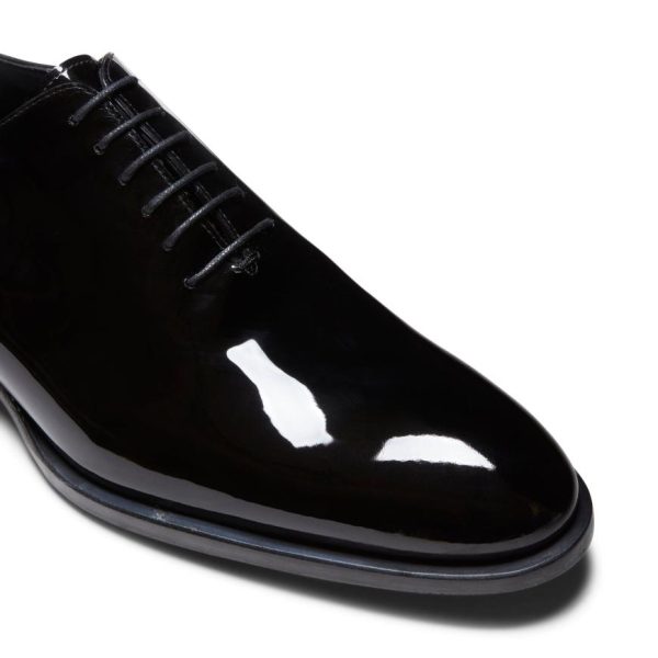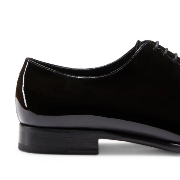 Refined Richelieu Oxford shoe in soft patent leather with a slightly tapered shape. An expression of impeccable elegance and expert craftsmanship. Leather sole.