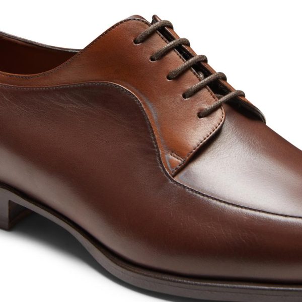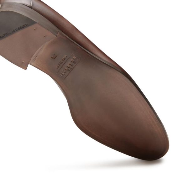 Raffinata scarpa Derby con lacci realizzata in morbida pelle bicolore blu e marrone. La calzatura si distingue per la cucitura che crea eleganti linee sinuose sulla tomaia. La pelle è colorata attraverso un processo di spazzolatura manuale, donando un aspetto finale con affascinanti sfumature anticate di grande carattere.