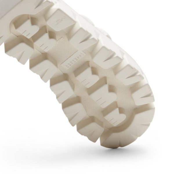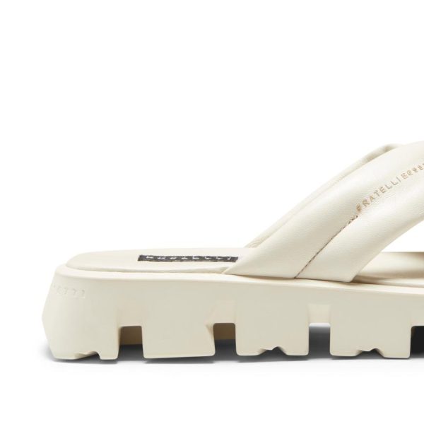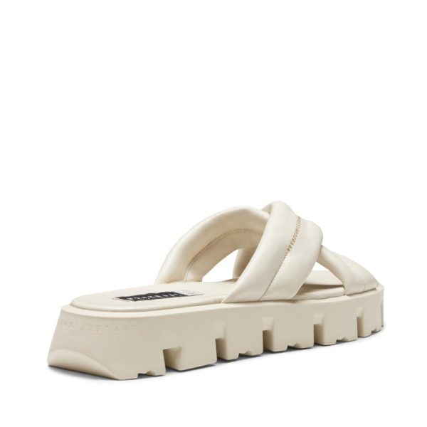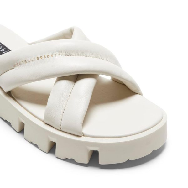 Slipper with criss-crossed bands, made of soft quilted leather, with a milk white nappa effect. Comfortable thanks to the contoured insole. The unique grooved sole makes it perfect for a casual yet refined look.