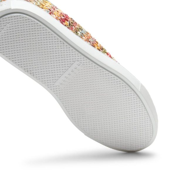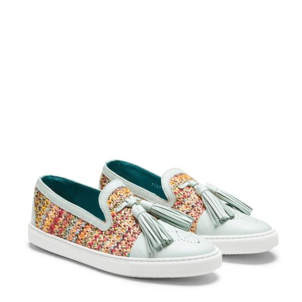 Hobo slipper with cupsole made of multicoloured fabric combined to create a woven effect. The pastel green leather front, tassels and trim add a handcrafted touch. Casual footwear that can be worn without laces thanks to practical internal elastics. Rubber sole with custom tread.