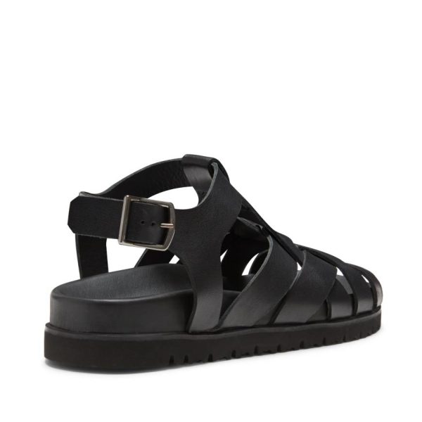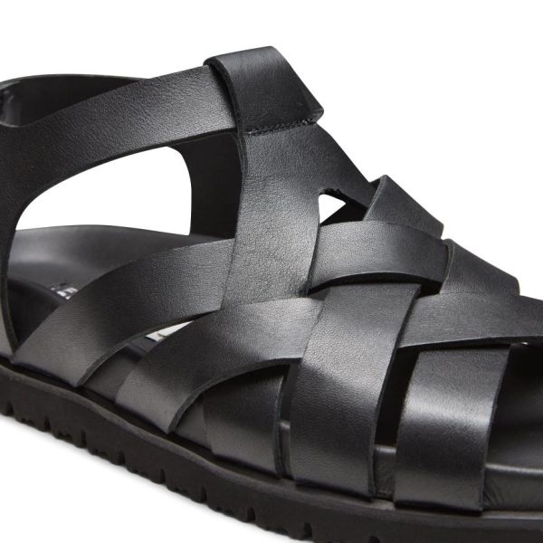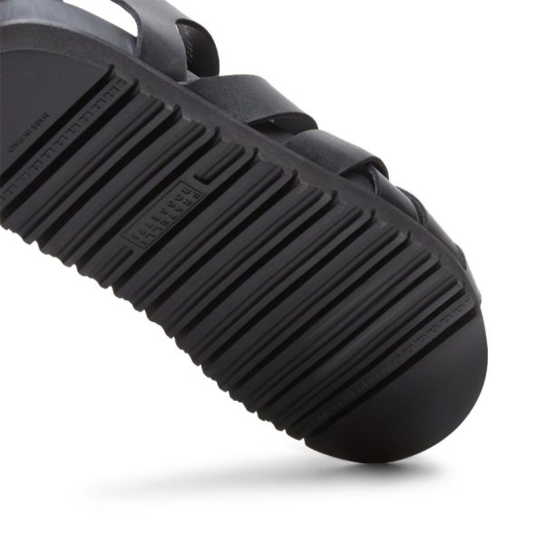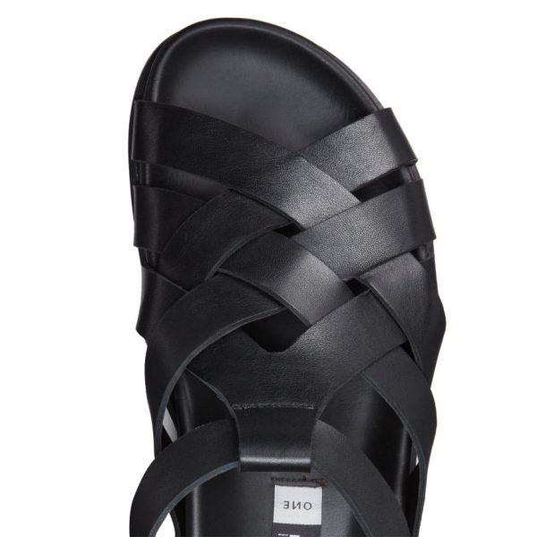 Refined sandal made of soft black leather with visible grain. Featuring criss-crossed bands with a raw-cut finish and ankle strap. The sophisticated yet casual design of this model is enhanced by a comfortable anatomical rubber sole that matches the colour of the upper.