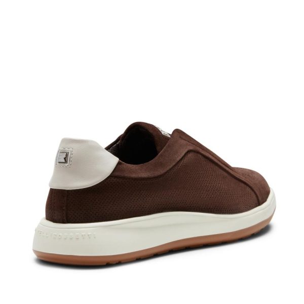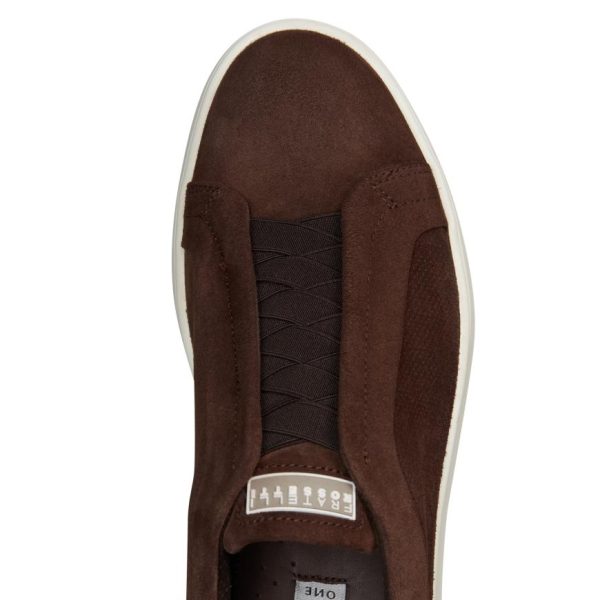 Made of soft, smooth perforated brown suede leather, this sneaker combines elegance and comfort. Thanks to the crossed elastics it can easily be worn like a slipper. Lightweight and flexible two-tone rubber sole.