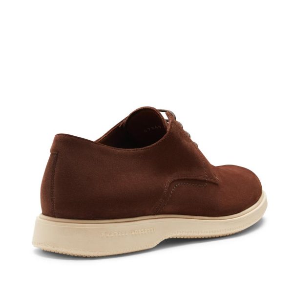 Smooth derby lace-up with a casual and refined look, made of chestnut-brown suede. The slightly rounded shape, deconstructed line and lightness of the sole make it versatile enough to complete all seasonal outfits.