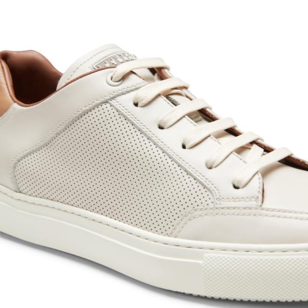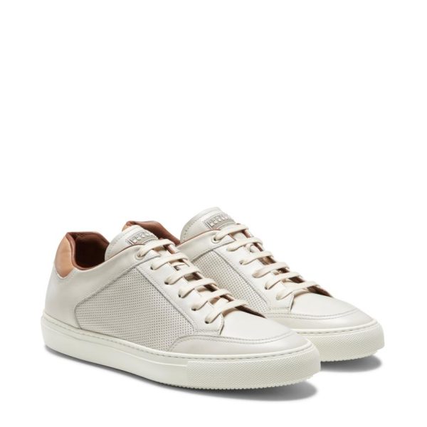 Sneaker with a cupsole and a dynamic and metropolitan look, made of soft, milk white leather. Featuring perforations on the sides of the upper and a contrasting insert on the heel with metal logo. The sports shoe is reworked with a handcrafted feel and sophisticated aesthetic finishes.